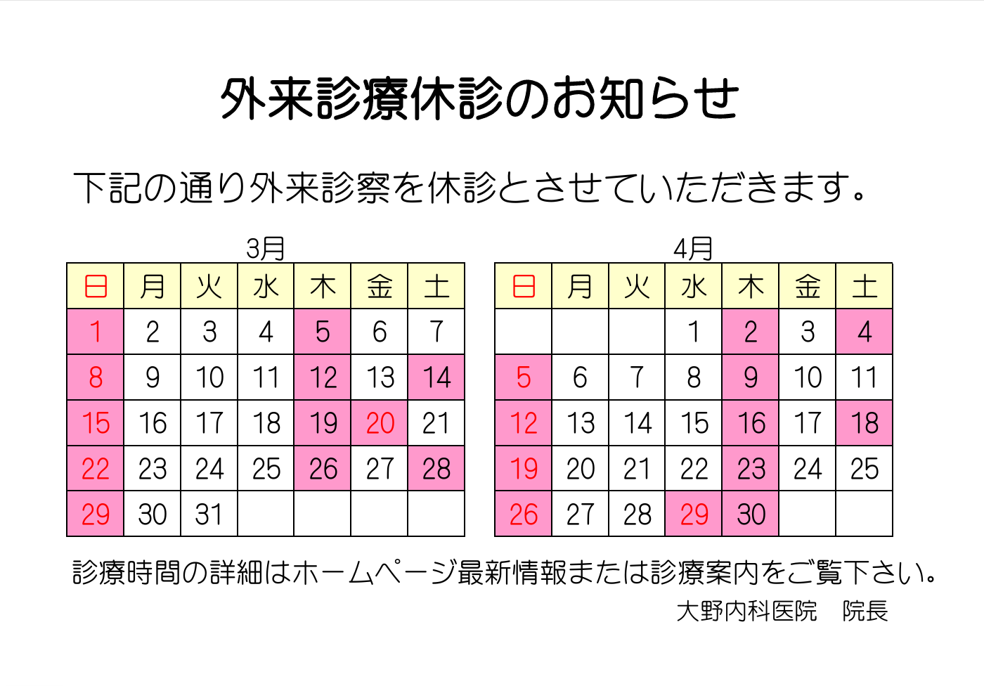 休診日のお知らせ 令和8年3月、4月の休診日の案内です。 <お知らせ>令和8年4月より、土曜日の休診日を毎月第1週、第3週とさせていただきます。ご不便をおかけしますが何卒よろしくお願い致します。大野内科医院 院長 大野修一